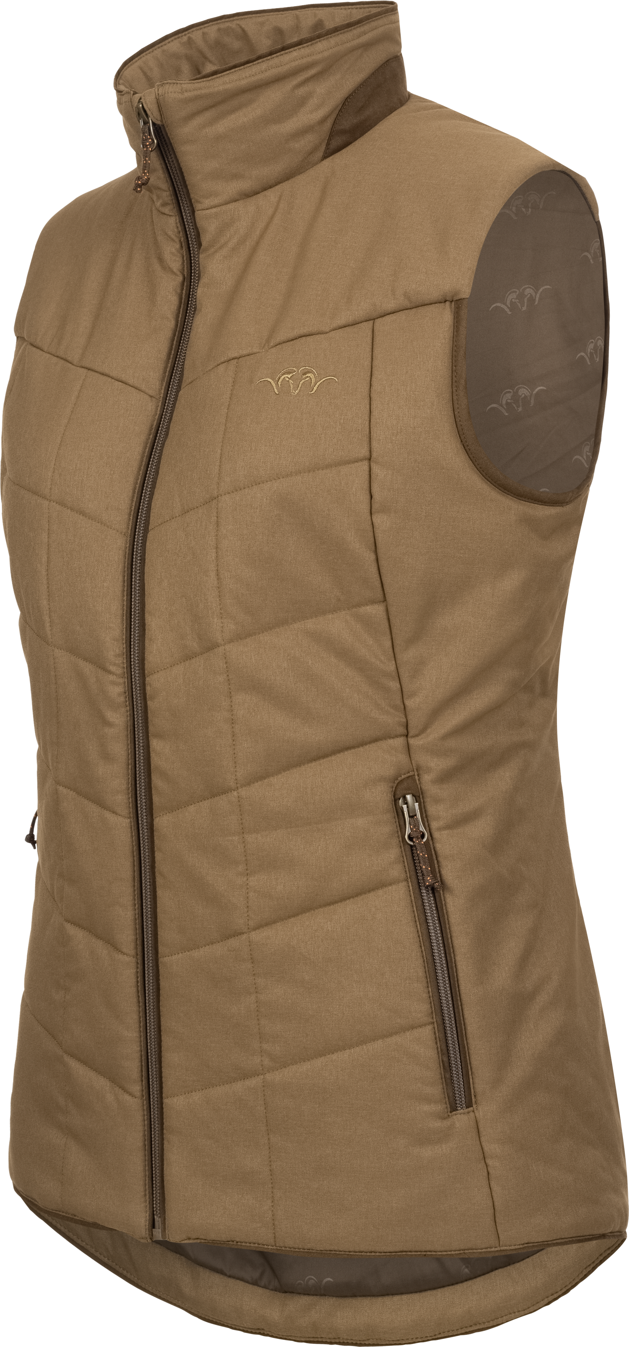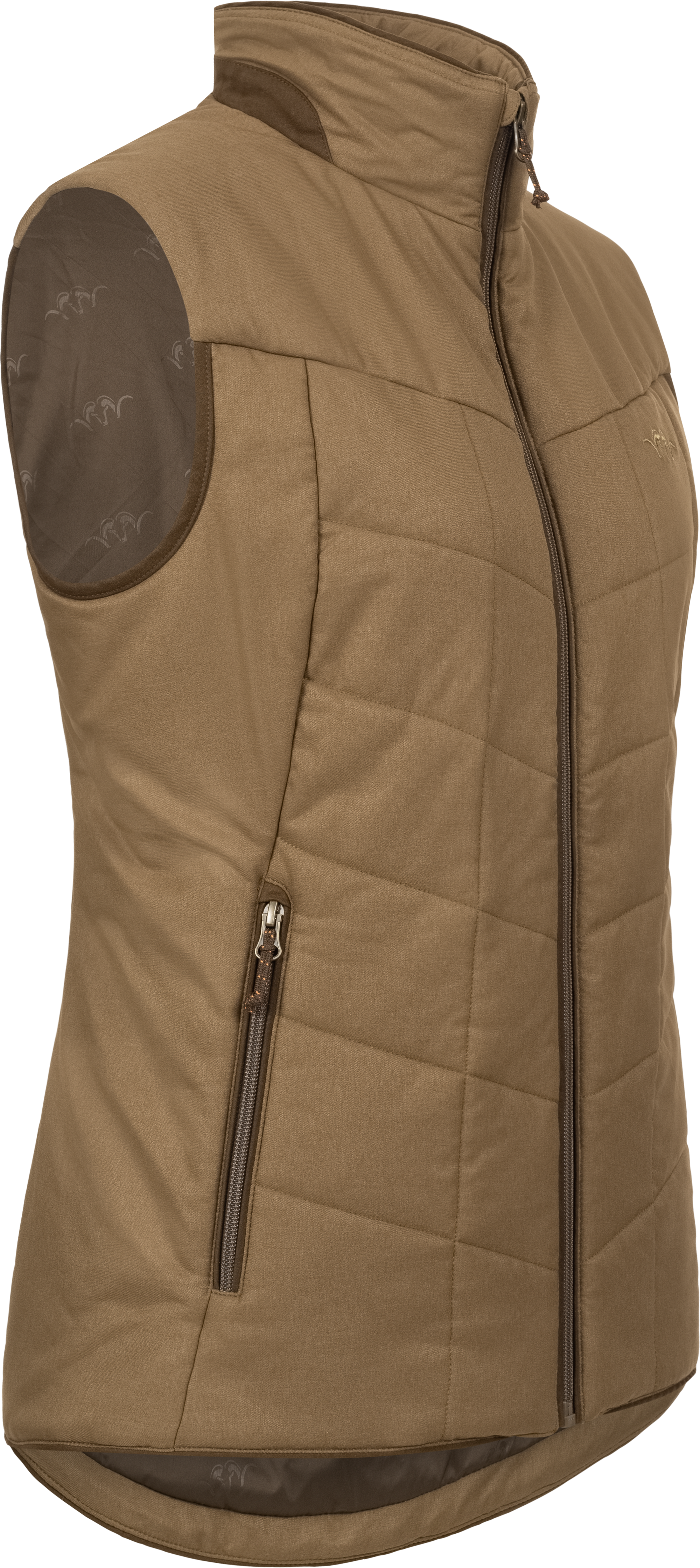 Die Damen Insulation Weste Eve überzeugt nicht nur durch ihre Funktionalität, sondern auch durch durchdachte Details. Die zwei praktischen Taschen im unteren Bereich bieten ausreichend Platz für Ihre persönlichen oder kleinere jagdliche Gegenstände und sind mit Suede-Details an den Reißverschlüssen verziert. Edle Suede-Akzente zieren ebenfalls den Kragen der Weste.