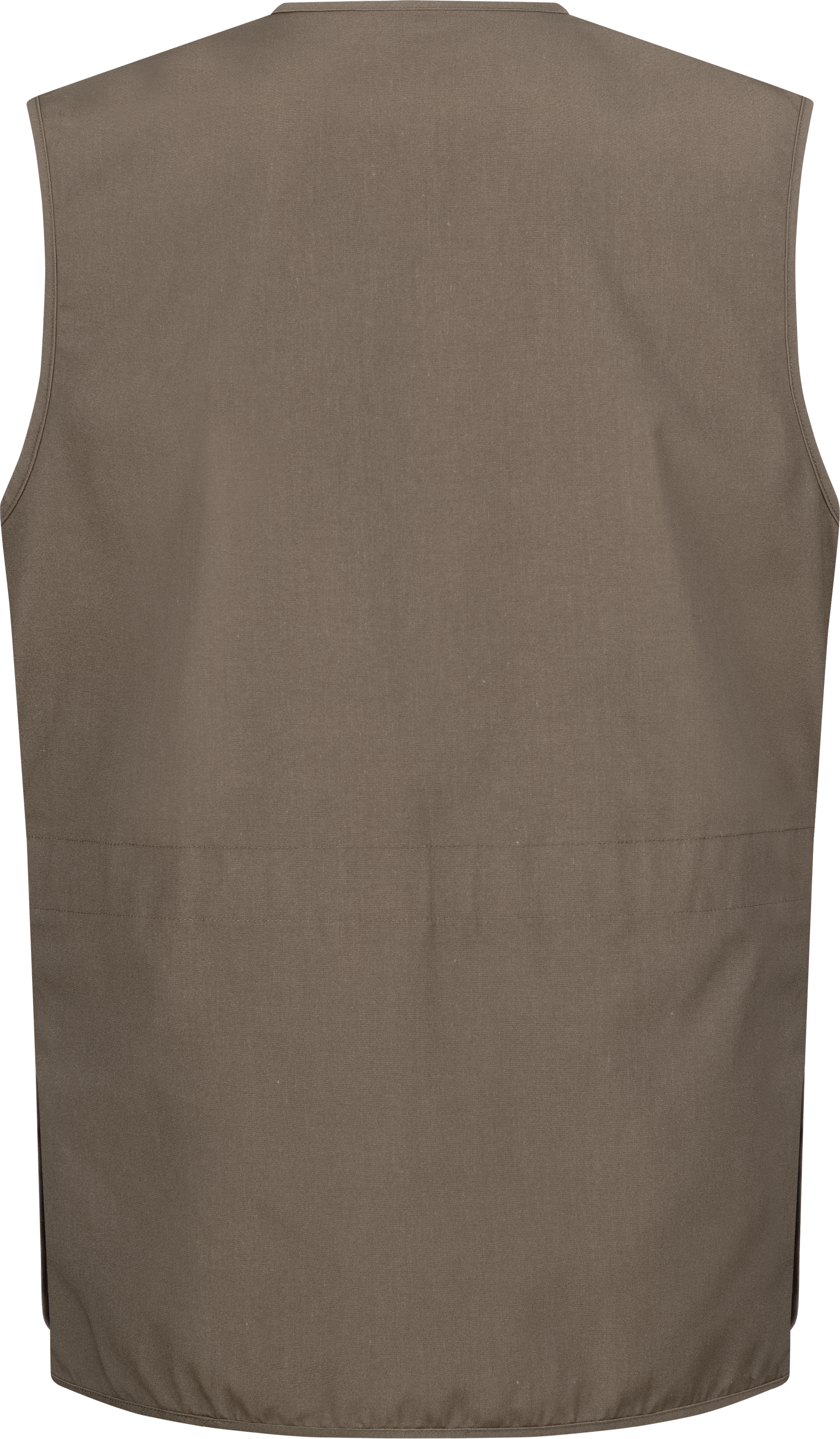 Shooting vest made from polyester/cotton blended material, synthetic l eather is used for non-slip gun mount area and to reinforce te pocket opening, side waist adjustment, inside pocket on right-hand side forgun recoil shock absorption insert.