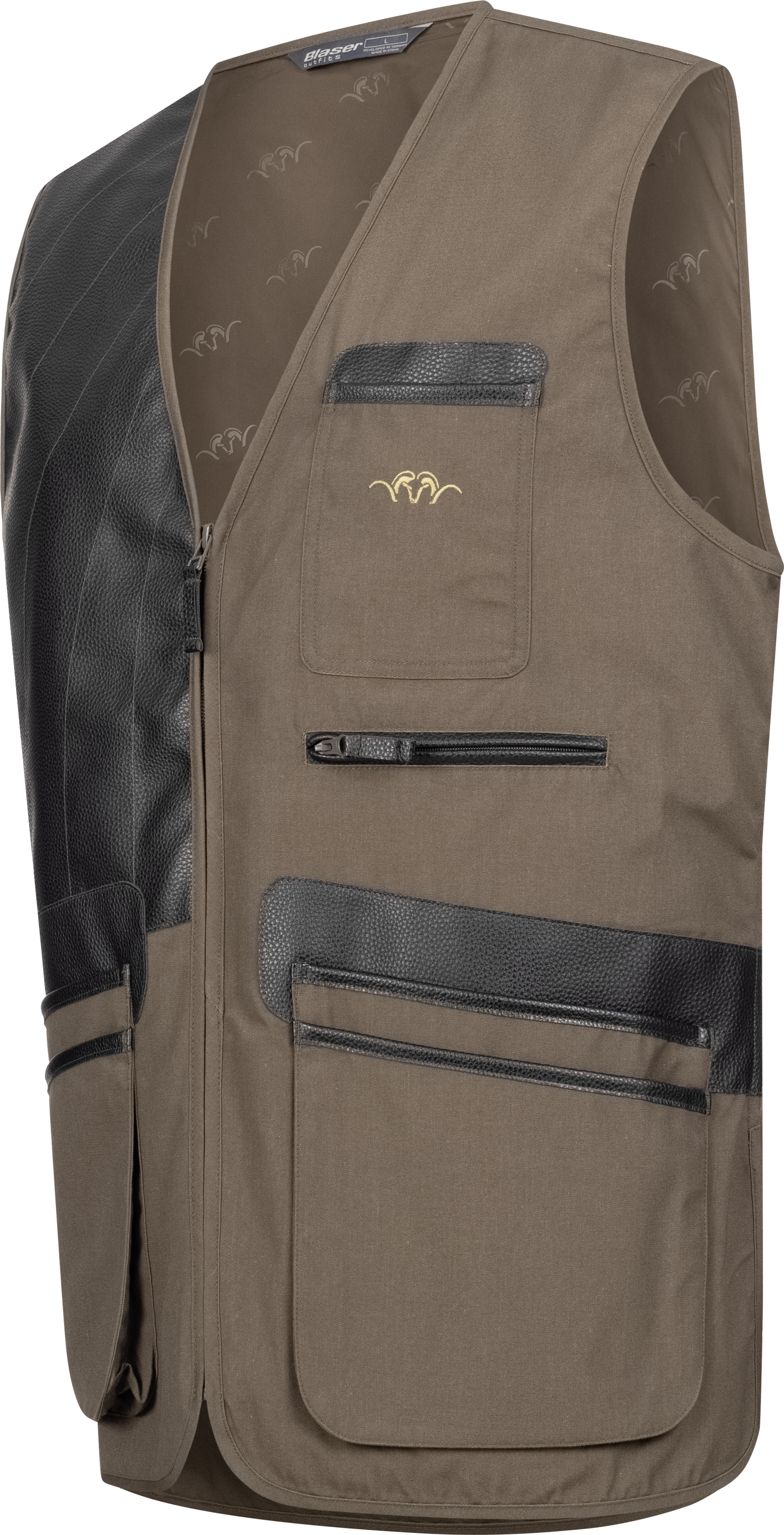 Advanced shooting vest with full features. Synthetic leather trim use d for gun mount on the right-hand side and pocket openings.