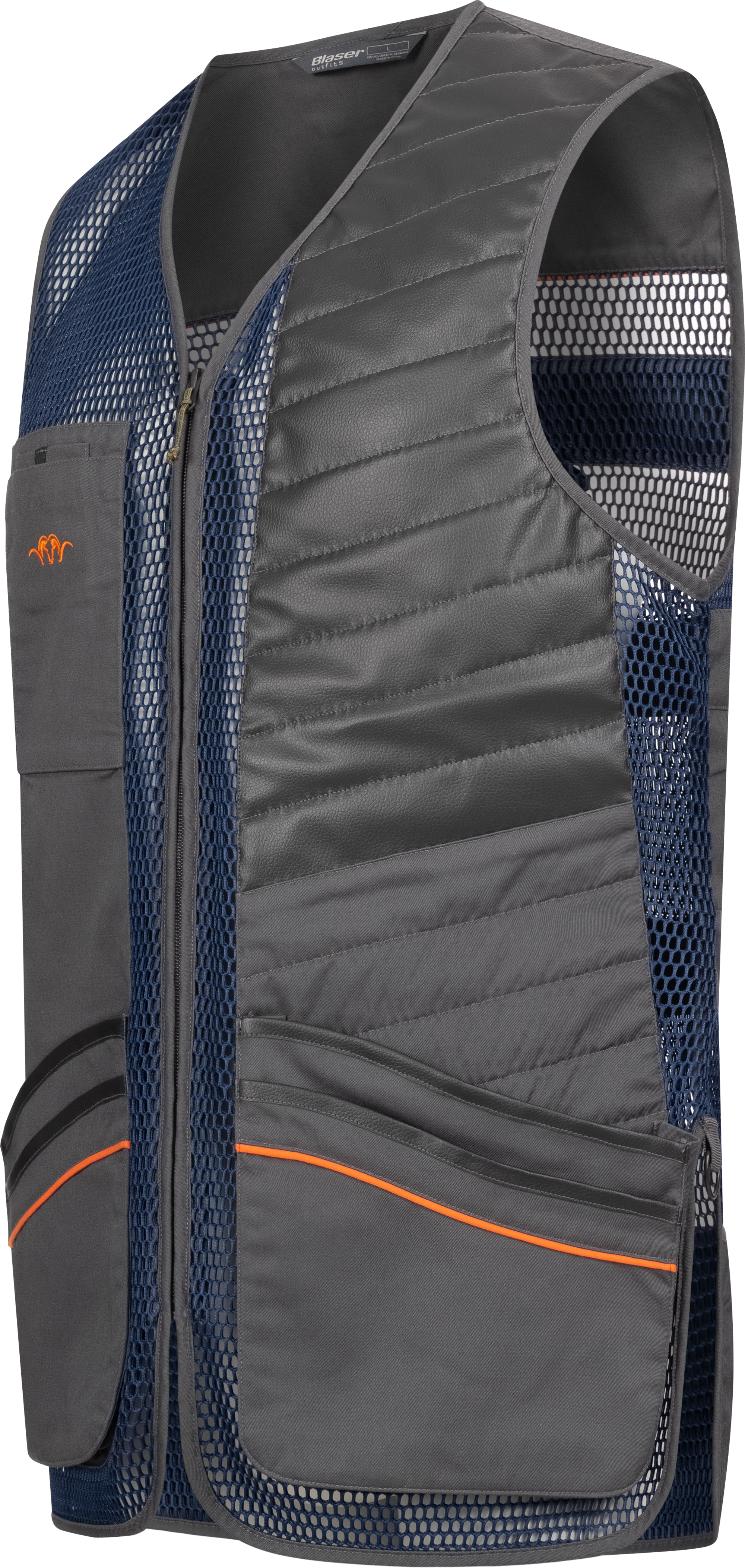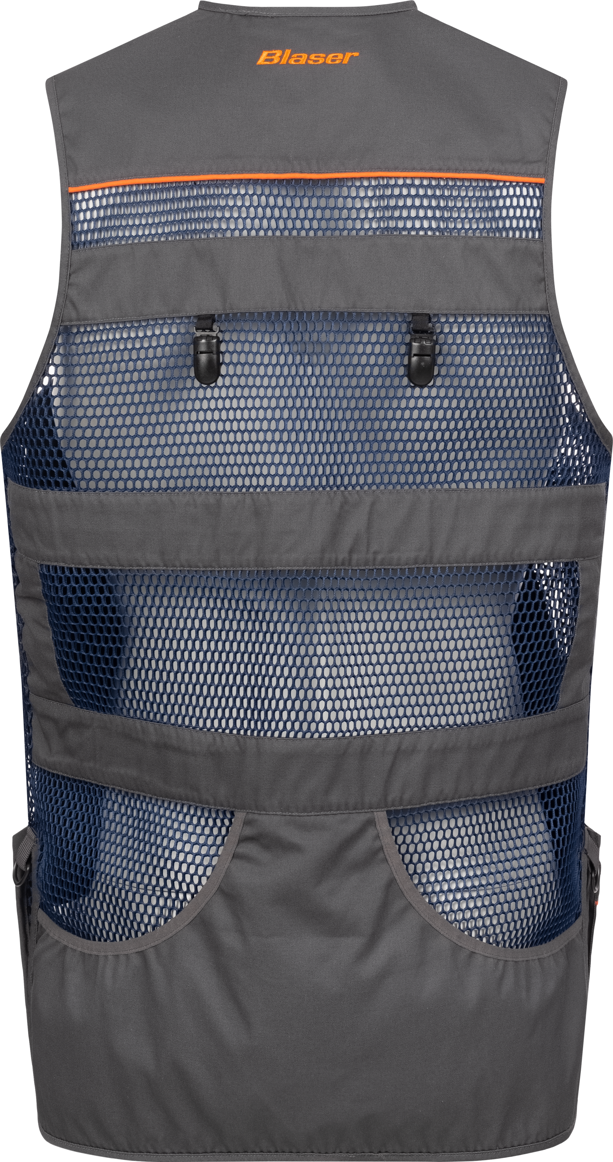 Shooting vest specifically designed for shotgun competition. Shooting patch on the left side that ensures the right grip for a prope mount. Open mesh construction for high breathability and full freedom of movement. Double front pockets. Dual back pockets. Back clips for competi tion number. Small lower chest pocket for ID, center front YK® zipper . Hidden waist adjustment in the back.