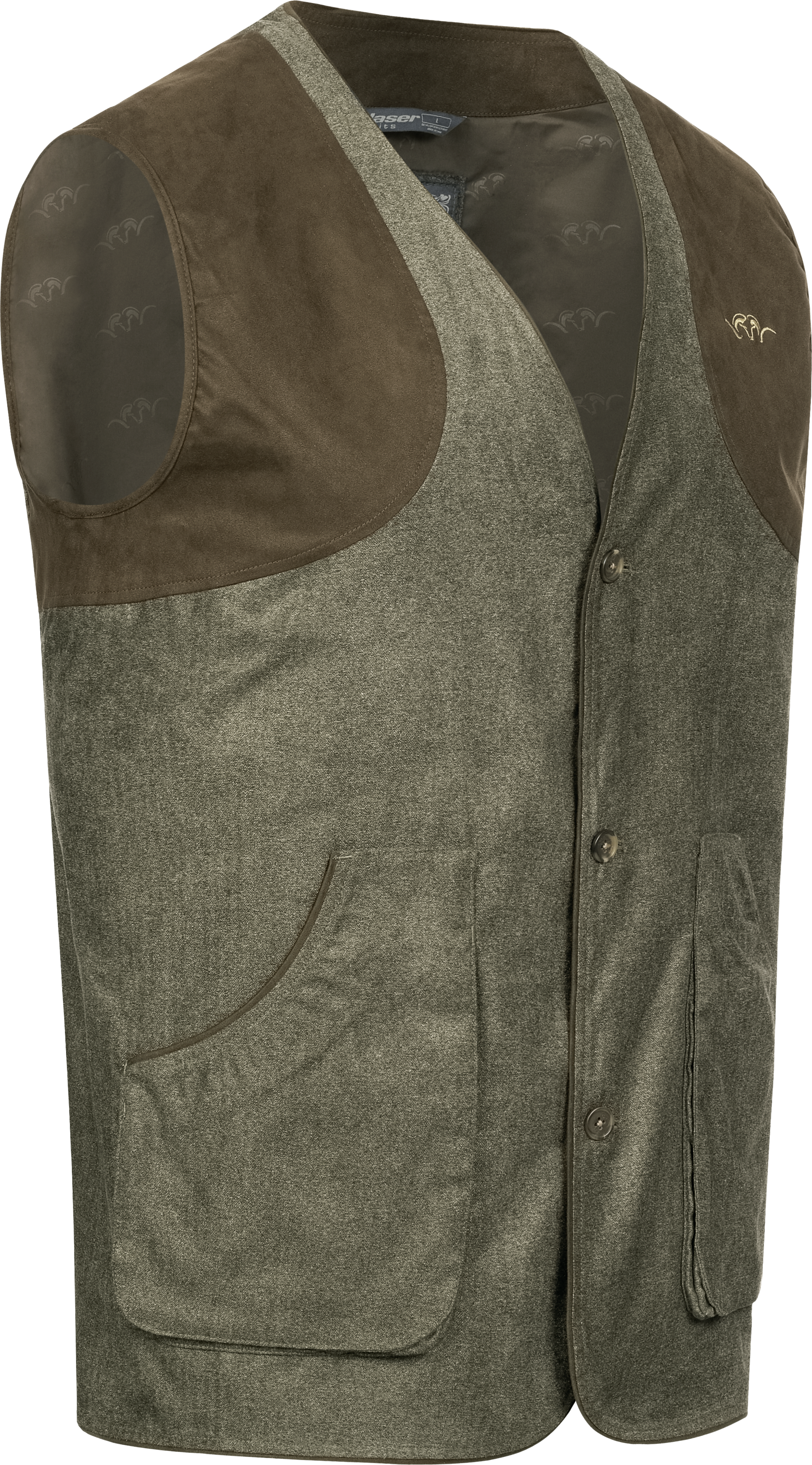 Suede detailing gives this vest its classic look. It combines Blaser V intage fabric in the body with suede fabric over the shoulder and par ticularly in the shot gun shouldering area, lightweight 40 g padding,2 large lower pockets with pleats and taffeta lining designed for easy access to the shot gun cartridges, suede piping along the frot butto ns.