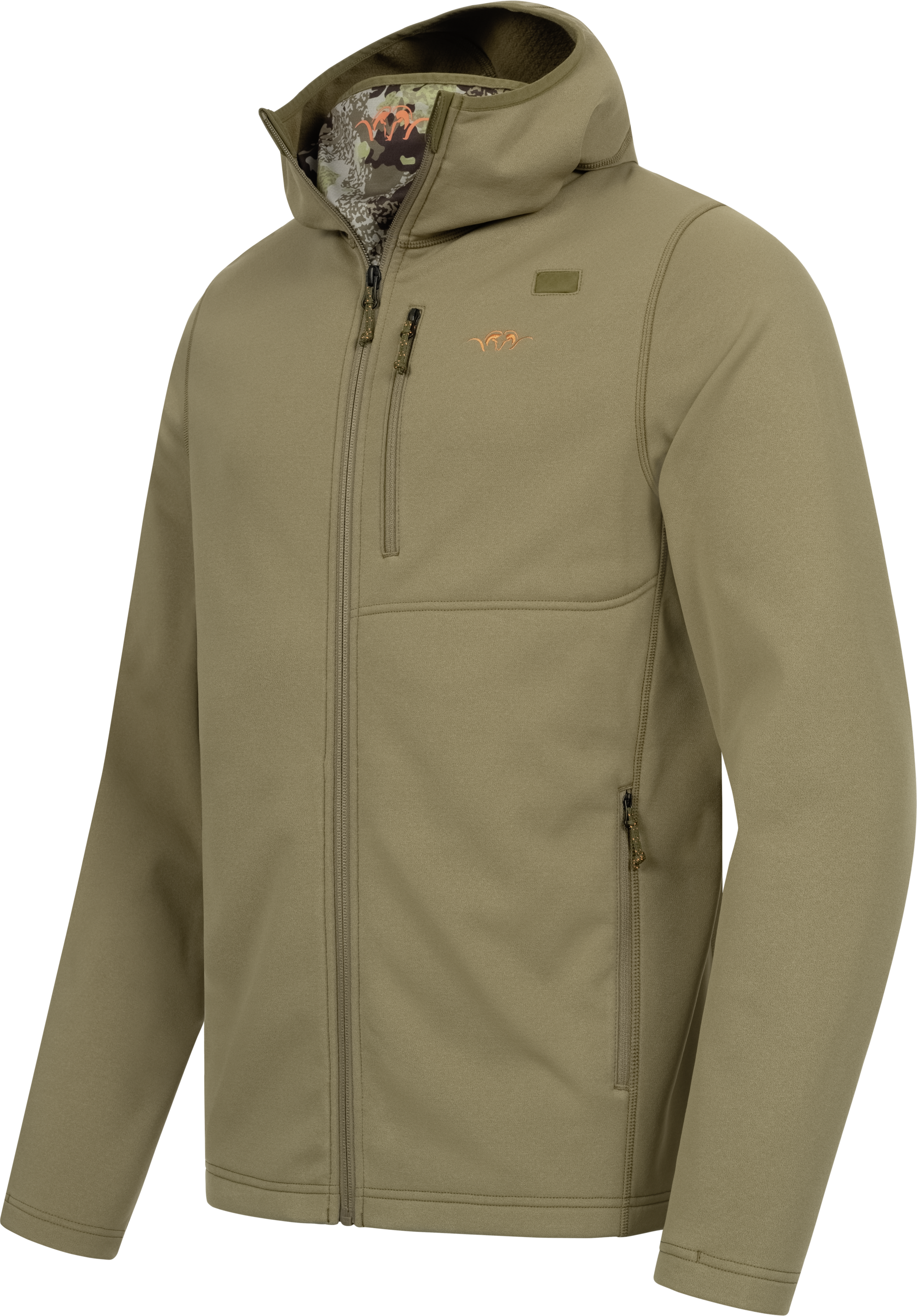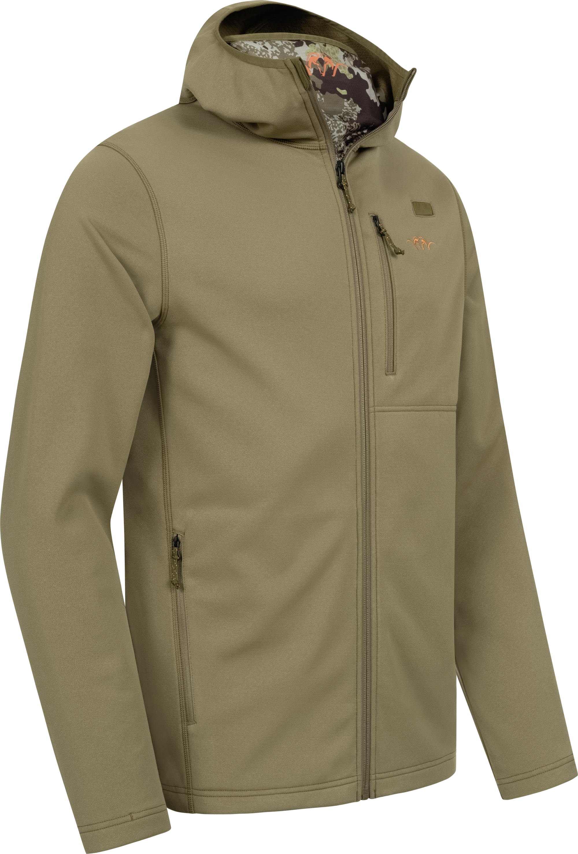 Technical midlayer hooded jacket with face mask integrated in the bac k of the hood, moisture wicking and fast drying fabric for hig perfo rmance hunting, 2 lower pockets.