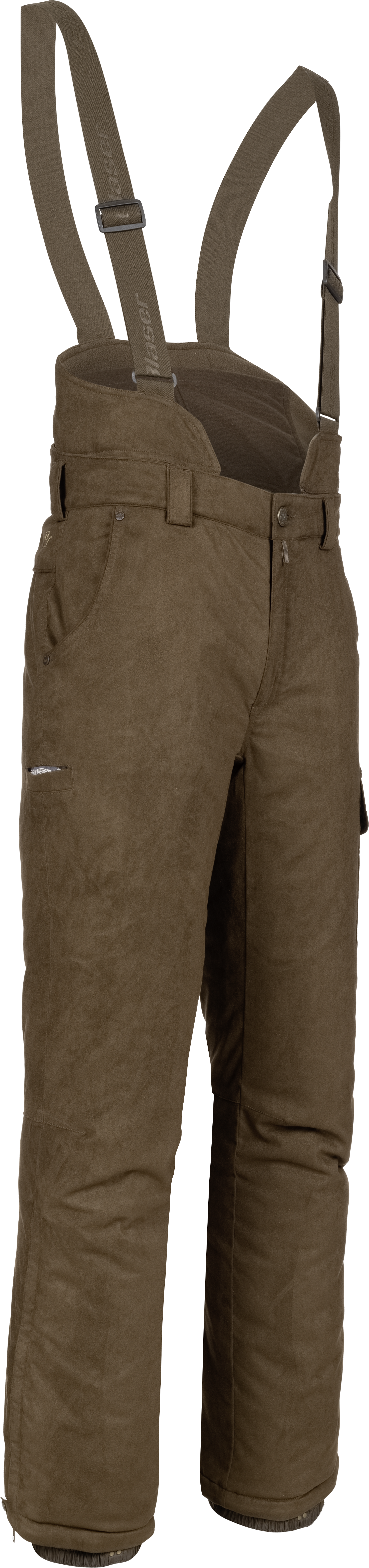 Suede winter bib pants for cold conditions, waterproof Z liner constru ction, 200 g Primaloft® padding, fleece lining over the top font side and back side, removable bib with adjustable suspenders and 2 pocketsfor portable heating elements over the kidney zone, belt loops, 2 top hand warmer pockets, 1 side pocket, 1 knife pocket, bottom hemadjust ment with side opening with wedge to pull over boots.