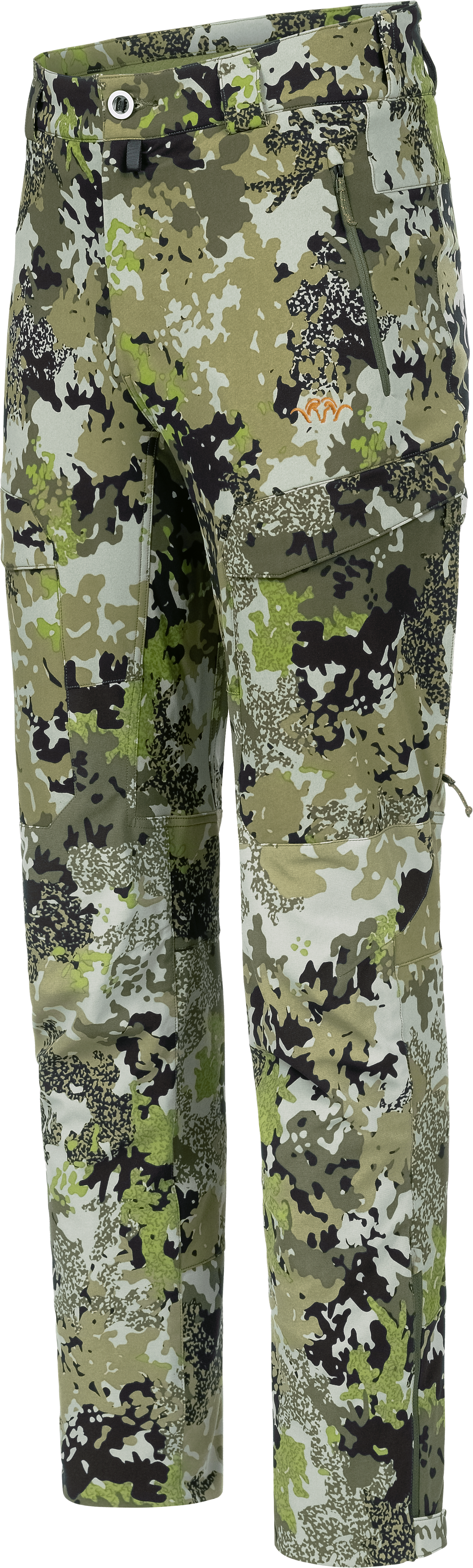 Hybrid Pants made from a combination of waterproof 3L fabricin the high contact zones (Bumb and downwards from the knee)and stretchable and wind resistant double weave fabricprovide the best mix for protection and the freedom ofmotion required for hunting. With S.Café® finish, ensureswarmth in cold conditions and in sitting and waitingsituations. Upper leg side ventilation. Back pack easyaccess top zip pockets. Two side leg with pockets. Beltbuckles with a suspender loop. Articulated knees.