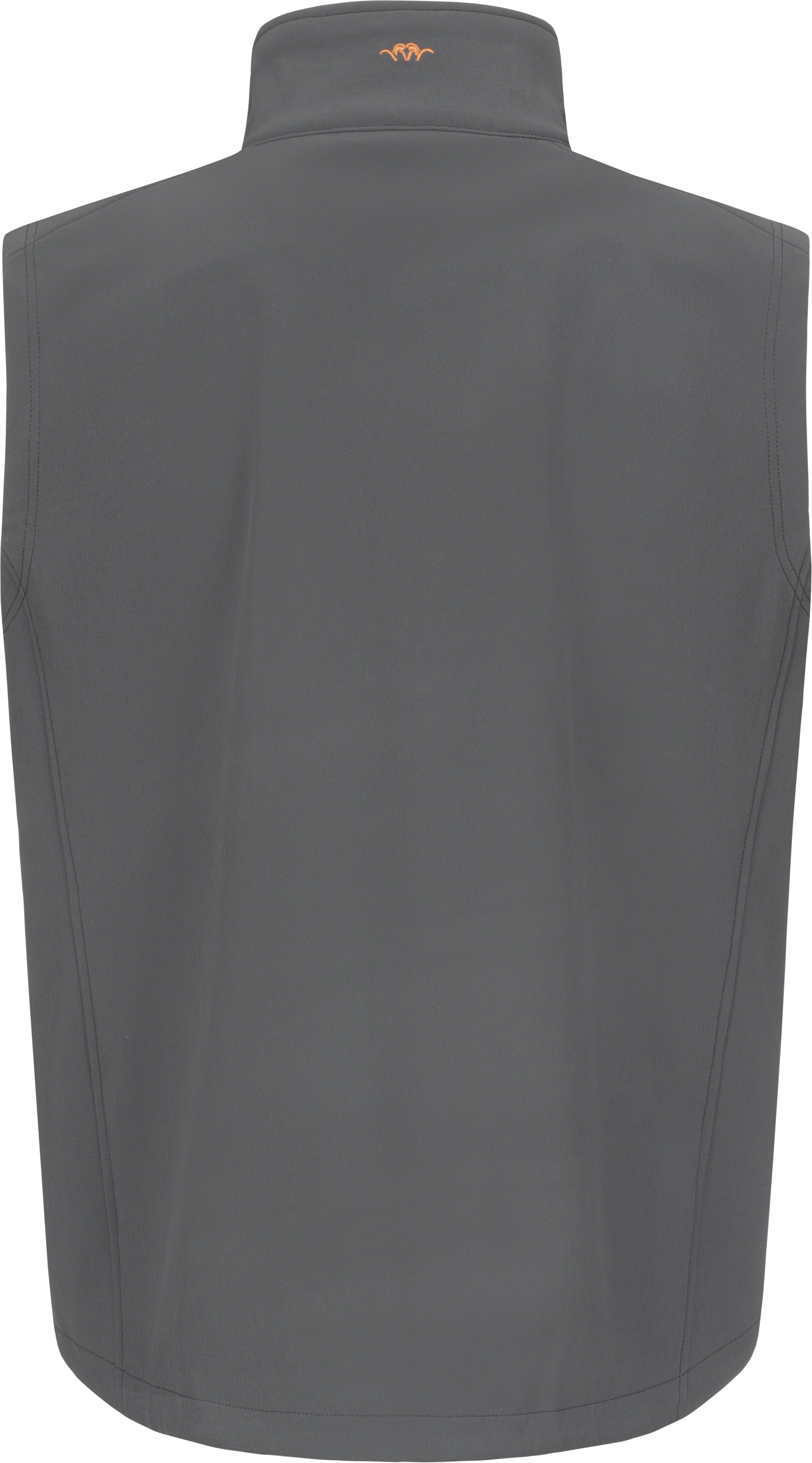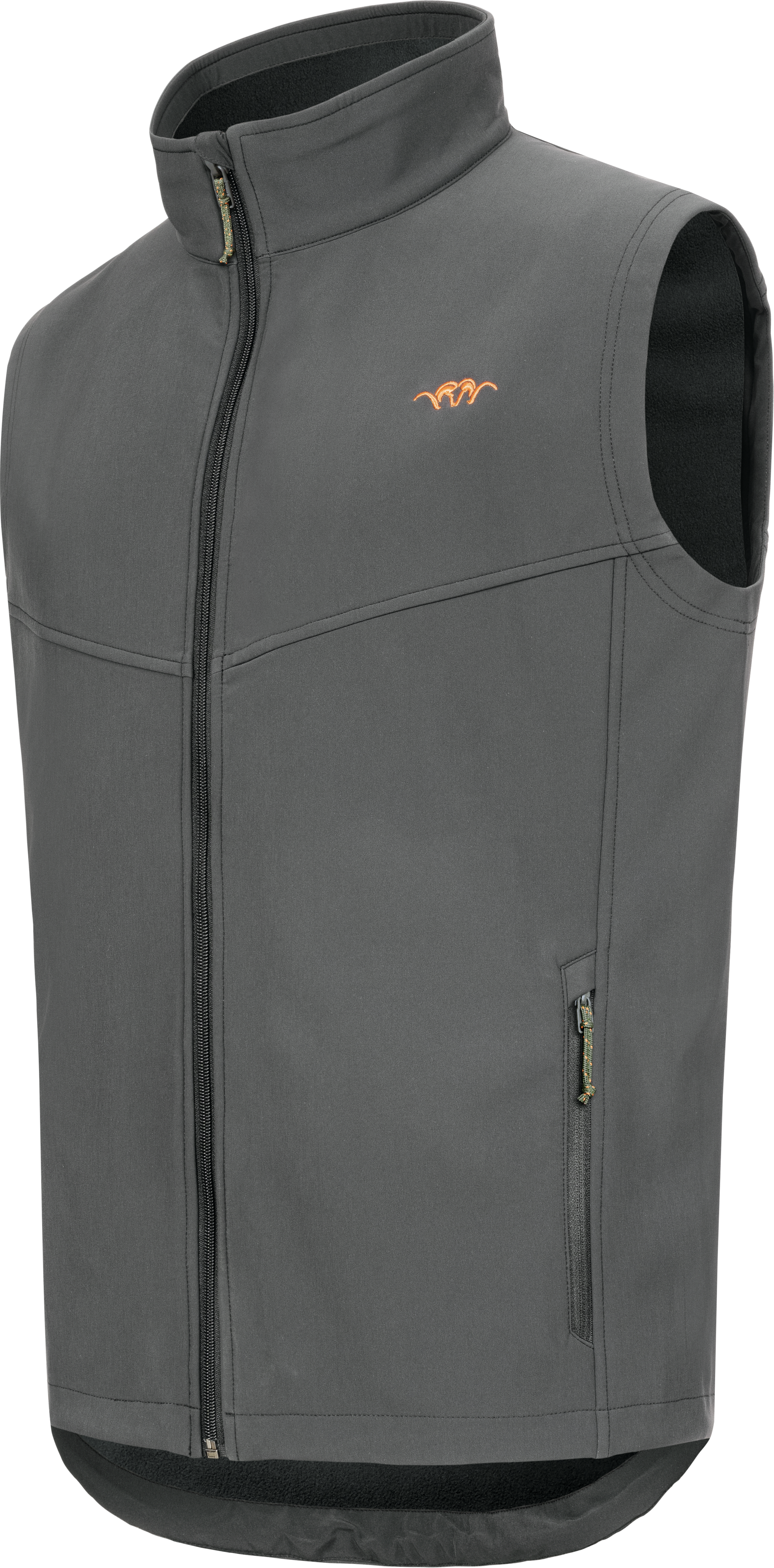 Softshell vest with nylon/spandex face side and soft brushed fleece ba ck side. Seamless side panel. 2 lower hand pockets. Chin protction