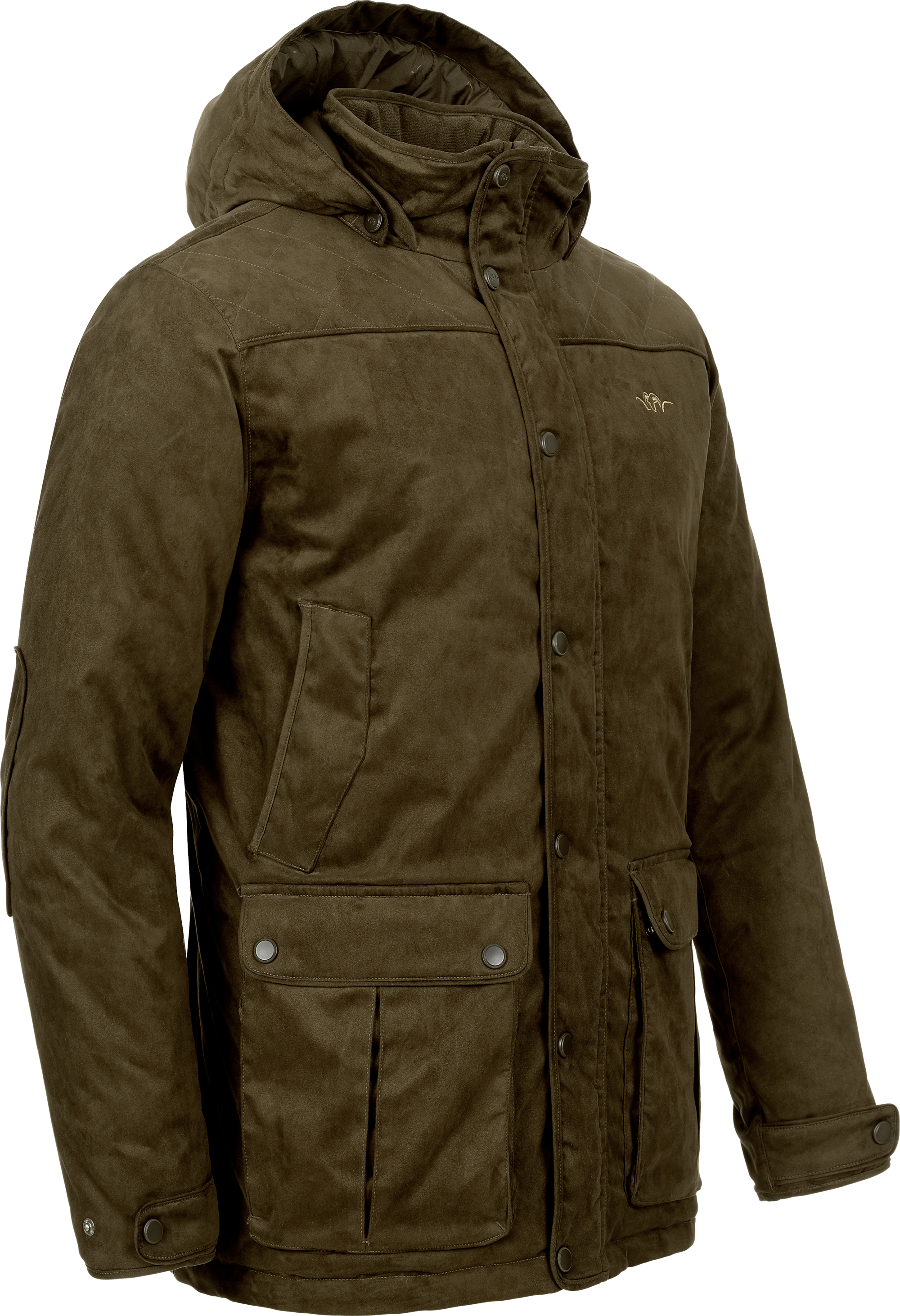 Suede Winter Jacket with Waterproof Z liner construction. Super warm p adding. Fleece lining. Two upper pockets and two lower spacios pleate d pockets with top and side entry. One spacious lower inside pocket. Quilted padding in shoulder and elbow. 2-way-zipper.